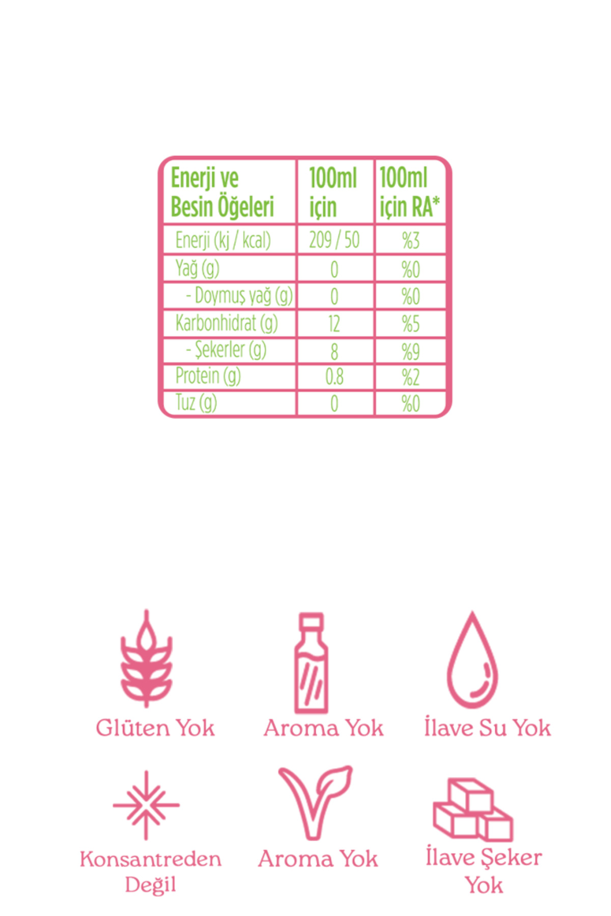 Organik karpuz suyu %20, Organik çilek püresi %20, Organik muz püresi %15, Organik elma püresi %15, Organik armut püresi %12, Organik karadut püresi %12, Organik kırmızı pancar suyu %3, Organik siyah havuç suyu %3
