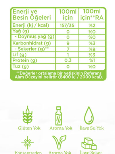 Glüten Yok | Aroma Yok | İlave Su Yok | Konsantreden Değil | İlave Şeker Yok